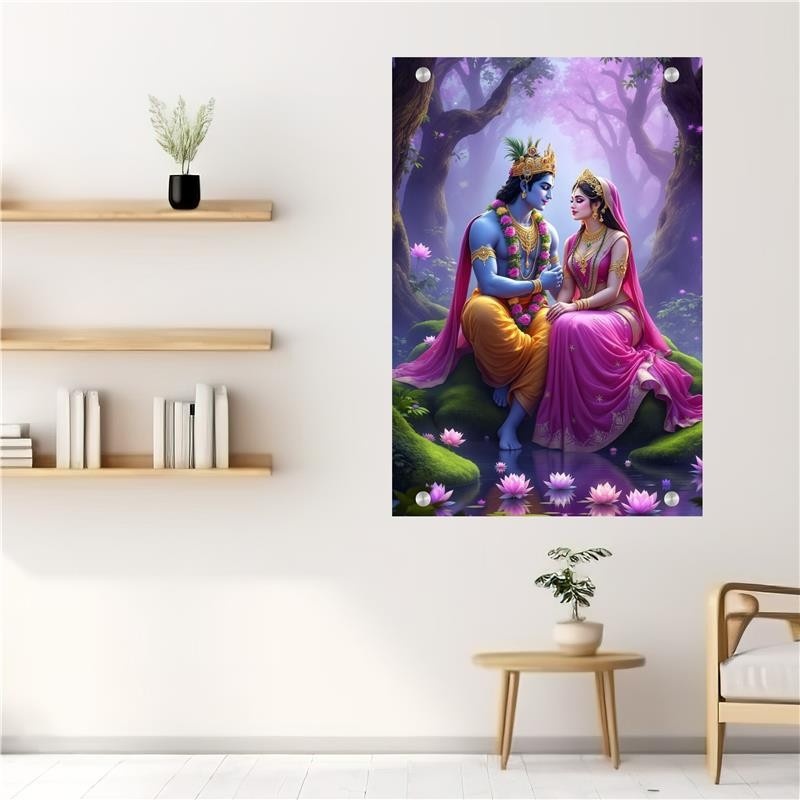 Celebrate the timeless love and spiritual bond of Radha and Krishna with this enchanting wall art. Set in a serene forest adorned with lotus flowers and soft mystical lighting, this artwork radiates peace, beauty, and divine romance. Their tender gaze and presence create a sacred ambiance, perfect for elevating the energy of any space.